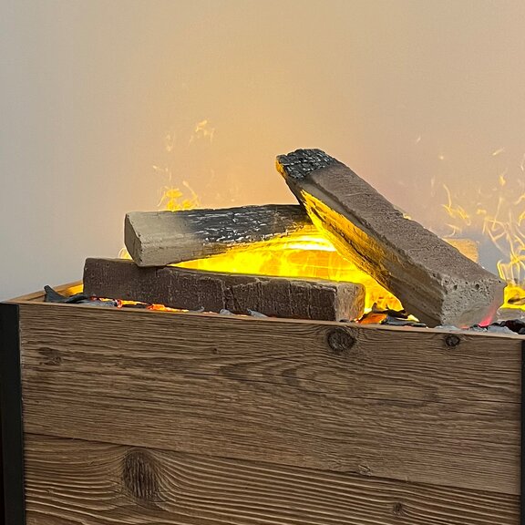 Das Elektrofeuer eSENSE ist mit hochwertigen Holzscheiten aus Keramik ausgestattet.