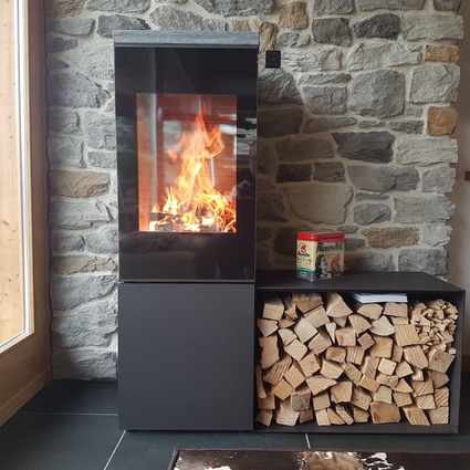 Gemütliche Stunden beim Ofen bieten die optionalen Seitenbänke und die integrierte Holzlagerfunktion unterhalb des Feuerraums. Das sieht nicht nur stilvoll aus, sondern ist auch super praktisch.